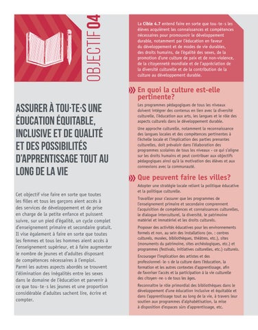 ASSURER À TOU·TE·S UNE ÉDUCATION ÉQUITABLE, INCLUSIVE ET DE QUALITÉ ET DES POSSIBILITÉS D’APPRENTISSAGE TOUT AU LONG DE LA VIE Cet objectif vise faire en sorte que toutes les filles et tous les garçons aient accès à des services de développement et de prise en charge de la petite enfance et puissent suivre, sur un pied d’égalité, un cycle complet d’enseignement primaire et secondaire gratuit. Il vise également à faire en sorte que toutes les femmes et tous les hommes aient accès à l’enseignement supérieur, et à faire augmenter le nombre de jeunes et d’adultes disposant de compétences nécessaires à l’emploi. Parmi les autres aspects abordés se trouvent l’élimination des inégalités entre les sexes dans le domaine de l’éducation et parvenir à ce que tou·te·s les jeunes et une proportion considérable d’adultes sachent lire, écrire et compter.