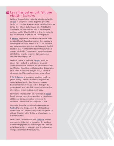 Les villes qui en ont fait une réalité - Exemples La Charte de coopération culturelle adoptée par la ville de Lyon et une grande variété de parties prenantes locales ont contribué à permettre une participation active de tou·te·s à la vie culturelle, ce qui a fait aboutir à la réduction des inégalités sociales, à davantage de cohésion sociale, à la visibilité de la diversité culturelle et à une meilleure adaptation des services publics. À Medellin, la politique culturelle locale compte parmi ses objectifs spécifiques la promotion du respect de la différence et l’inclusion de tou·te·s à la vie culturelle, avec des programmes abordant spécifiquement l’égalité des sexes et la reconnaissance des droits culturels des groupes vulnérables (communautés afro-colombiennes et indigènes, enfants, personnes âgées, personnes déplacées dans le pays, etc.). La Charte culture et solidarité d’Angers réunit les acteur·rice·s culturel·le·s et sociaux·les, avec l’objectif commun de permettre aux personnes souffrant de difficultés financières ou d’isolement ou défavorisées, de se sentir de véritables citoyen·ne·s, à travers la découverte de différentes formes d’art et de culture. À Rio de Janeiro, le programme « Actions Locales » (Ações Locais) a permis d’accroître la disponibilité des activités culturelles dans des zones recevant traditionnellement moins de soutien de la part du gouvernement, et a contribué à renforcer les quartiers en périphérie et leur développement local. La Maison d’échanges entre les populations à Nilüfer fournit un espace pour la préservation, la visualisation et l’échange de souvenirs et du patrimoine des différentes communautés qui composent la ville. L’approche de médiation culturelle développée par Montréal favorise l’engagement des artistes et des professionnel·le·s de la culture pour encourager l’accès et la participation active de tou·te·s les citoyen·ne·s à la vie culturelle. La fête de La Carrera del Gancho à Saragosse promeut une approche intégrale à la rénovation des quartiers, à travers l’engagement actif des citoyen·ne·s dans les activités culturelles et un espace pour la collaboration intergénérationnelle et interculturelle.