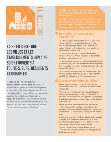 La Cible 11.4 établit de redoubler d’efforts pour protéger et préserver le patrimoine culturel et naturel mondial. La Cible 11.7 fait référence à la garantie d’accès de tous, en particulier des femmes et des enfants, des personnes âgées et des personnes handicapées, à des espaces verts et des espaces publics sûrs.