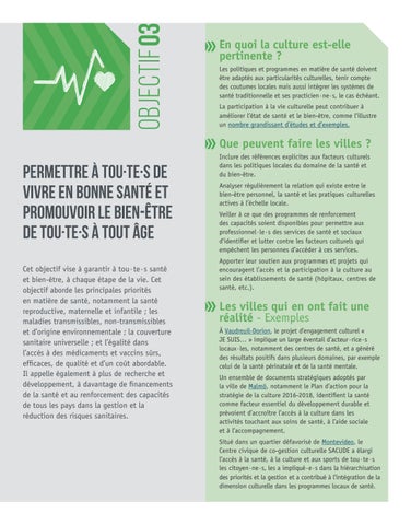 Les villes qui en ont fait une réalité - Exemples À Vaudreuil-Dorion, le projet d’engagement culturel « JE SUIS… » implique un large éventail d’acteur·rice·s locaux·les, notamment des centres de santé, et a généré des résultats positifs dans plusieurs domaines, par exemple celui de la santé périnatale et de la santé mentale. Un ensemble de documents stratégiques adoptés par la ville de Malmö, notamment le Plan d’action pour la stratégie de la culture 2016-2018, identifient la santé comme facteur essentiel du développement durable et prévoient d’accroître l’accès à la culture dans les activités touchant aux soins de santé, à l’aide sociale et à l’accompagnement. Situé dans un quartier défavorisé de Montevideo, le Centre civique de co-gestion culturelle SACUDE a élargi l’accès à la santé, à la culture et aux sports de tou·te·s les citoyen·ne·s, les a impliqué·e·s dans la hiérarchisation des priorités et la gestion et a contribué à l’intégration de la dimension culturelle dans les programmes locaux de santé.