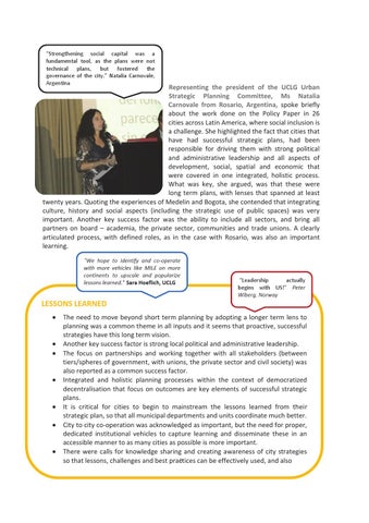 The need to move beyond short term planning by adopting a longer term lens to planning was a common theme in all inputs and it seems that proactive, successful strategies have this long term vision. Another key success factor is strong local political and administrative leadership. The focus on partnerships and working together with all stakeholders (between tiers/spheres of government, with unions, the private sector and civil society) was also reported as a common success factor. Integrated and holistic planning processes within the context of democratized decentralisation that focus on outcomes are key elements of successful strategic plans. It is critical for cities to begin to mainstream the lessons learned from their strategic plan, so that all municipal departments and units coordinate much better. City to city co-operation was acknowledged as important, but the need for proper, dedicated institutional vehicles to capture learning and disseminate these in an accessible manner to as many cities as possible is more important. There were calls for knowledge sharing and creating awareness of city strategies 6 so that lessons, challenges and best practices can be effectively used, and also for proper support to adapt local tools from one city to another, given their unique