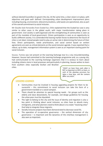 without elected Councillors to govern the city. At the same time, a clear vision is in place, with objectives and goals well- defined. Corresponding urban development improvement plans including housing, environment, telecommunications, solid waste are operational, also as part of the overall commitment to social inclusion. Mr Claudio Sule Fernandes from Ciudad Sur, Chile explained that the Ciudad Sur case is very similar to other cases in the global south, with major transformation taking place in government. Civil society is well-organised and the strengthening of communities is seen as part of the mandate of local government. Citizen participation is seen as an opportunity to build a different society. It is contended that leaving market forces to determine the future of cities is not ideal; instead people need to play an active role in determining the future of their lives. Direct participation, needs prioritisation, and social control based on written agreements are seen as critical elements on the social inclusion agenda. It was reported that a robust, up to date, management information system is seen as an important starting point for social inclusion. Sousse, Tunisia was not present at the Learning Exchange due to a visa misunderstanding. However, Sousse had committed to the Learning Exchange programme and, as a young city, had communicated to the Learning Exchange organisers that it is anxious to learn about including citizens more in local processes and particularly in planning. Sousse wishes to learn from southern cities especially Durban and Brazilian cities. “WHAT we learn from each other is NOT as important as HOW we learn, as each of the planning processes has taken a long time, and the contexts differ very much.”