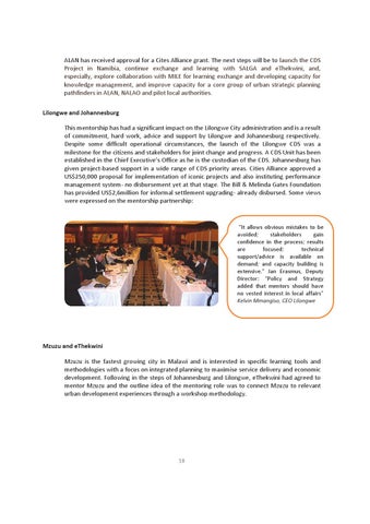 ALAN has received approval for a Cites Alliance grant. The next steps will be to launch the CDS Project in Namibia, continue exchange and learning with SALGA and eThekwini, and, especially, explore collaboration with MILE for learning exchange and developing capacity for knowledge management, and improve capacity for a core group of urban strategic planning pathfinders in ALAN, NALAO and pilot local authorities. Lilongwe and Johannesburg This mentorship has had a significant impact on the Lilongwe City administration and is a result of commitment, hard work, advice and support by Lilongwe and Johannesburg respectively. Despite some difficult operational circumstances, the launch of the Lilongwe CDS was a milestone for the citizens and stakeholders for joint change and progress. A CDS Unit has been established in the Chief Executive’s Office as he is the custodian of the CDS. Johannesburg has given project-based support in a wide range of CDS priority areas. Cities Alliance approved a US$250,000 proposal for implementation of iconic projects and also instituting performance management system- no disbursement yet at that stage. The Bill & Melinda Gates Foundation has provided US$2,6million for informal settlement upgrading- already disbursed. Some views were expressed on the mentorship partnership:
