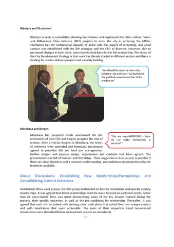 Divided into three work groups, the first group deliberated on how to consolidate and upscale existing mentorships. It was agreed that future mentorships must be more focused on particular needs, rather than be open-ended. Time was spent documenting some of the key lessons learned during the process, their specific successes, as well as the pre-conditions for mentorship. Thereafter, it was agreed that each city be tasked with devising clear work plans that suited their own unique context and with timeframes that were achievable. The roles of their respective Local Government Associations were also identified as an important area to be considered. 19