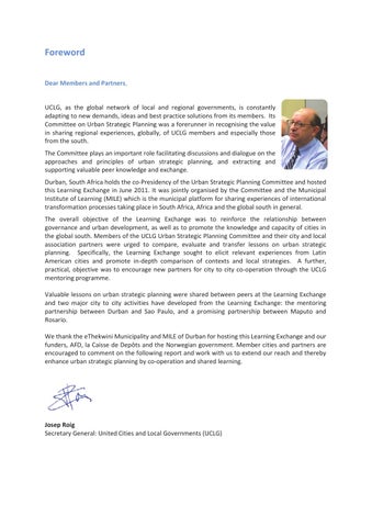 UCLG, as the global network of local and regional governments, is constantly adapting to new demands, ideas and best practice solutions from its members. Its Committee on Urban Strategic Planning was a forerunner in recognising the value in sharing regional experiences, globally, of UCLG members and especially those from the south. The Committee plays an important role facilitating discussions and dialogue on the approaches and principles of urban strategic planning, and extracting and supporting valuable peer knowledge and exchange. Durban, South Africa holds the co-Presidency of the Urban Strategic Planning Committee and hosted this Learning Exchange in June 2011. It was jointly organised by the Committee and the Municipal Institute of Learning (MILE) which is the municipal platform for sharing experiences of international transformation processes taking place in South Africa, Africa and the global south in general. The overall objective of the Learning Exchange was to reinforce the relationship between governance and urban development, as well as to promote the knowledge and capacity of cities in the global south. Members of the UCLG Urban Strategic Planning Committee and their city and local association partners were urged to compare, evaluate and transfer lessons on urban strategic planning. Specifically, the Learning Exchange sought to elicit relevant experiences from Latin American cities and promote in-depth comparison of contexts and local strategies. A further, practical, objective was to encourage new partners for city to city co-operation through the UCLG mentoring programme. Valuable lessons on urban strategic planning were shared between peers at the Learning Exchange and two major city to city activities have developed from the Learning Exchange: the mentoring partnership between Durban and Sao Paulo, and a promising partnership between Maputo and Rosario. We thank the eThekwini Municipality and MILE of Durban for hosting this Learning Exchange and our funders, AFD, la Caisse de Dep么ts and the Norwegian government. Member cities and partners are encouraged to comment on the following report and work with us to extend our reach and thereby enhance urban strategic planning by co-operation and shared learning.