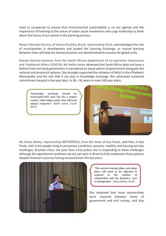 need to co-operate to ensure that environmental sustainability is on our agenda and the importance of listening to the voices of urban social movements who urge leadership to think about the future of our planet in the planning process. Mayor Eduardo Pereira, of Varzea Paulista, Brazil, representing UCLG, acknowledged the role of municipalities in development and lauded the Learning Exchange, as mutual learning between cities will help the democratisation and decentralisation process for global unity. Deputy Director-General, from the South African Department of Co-operative Governance and Traditional Affairs (COGTA), Ms Nellie Lester observed that South Africa does not have a federal state but local government is considered an equal sphere of government alongside the national and provincial spheres. She strongly supported the initiation of MILE in the eThekwini Municipality and the role that it can play in knowledge exchange. She advocated sustained commitment beyond a five year plan, to 30 – 50 years or even 100 year plans.