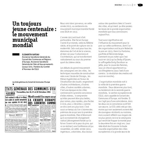 Un toujours jeune centenaire : le mouvement municipal mondial Elisabeth Gateau Ancienne Secrétaire Générale du Conseil des Communes et Régions d’Europe, Ancienne Secrétaire Générale de Cités et Gouvernements Locaux Unis. Membre du Comité d’Honneur de CGLU