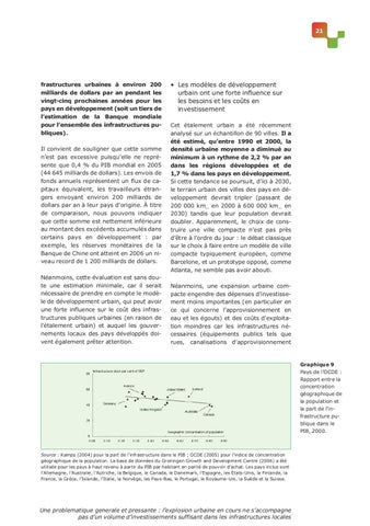 • Les modèles de développement urbain ont une forte influence sur les besoins et les coûts en investissement Cet étalement urbain a été récemment analysé sur un échantillon de 90 villes. Il a été estimé, qu’entre 1990 et 2000, la densité urbaine moyenne a diminué au minimum à un rythme de 2,2 % par an dans les régions développées et de 1,7 % dans les pays en développement. Si cette tendance se poursuit, d’ici à 2030, le terrain urbain des villes des pays en développement devrait tripler (passant de 200 000 km_ en 2000 à 600 000 km_ en 2030) tandis que leur population devrait doubler. Apparemment, le choix de construire une ville compacte n’est pas près d’être à l’ordre du jour : le débat classique sur le choix à faire entre un modèle de ville compacte typiquement européen, comme Barcelone, et un prototype opposé, comme Atlanta, ne semble pas avoir abouti. Néanmoins, une expansion urbaine compacte engendre des dépenses d’investissement moins importantes (en particulier en ce qui concerne l’approvisionnement en eau et les égouts) et des coûts d’exploitation moindres car les infrastructures nécessaires (équipements publics tels que rues, canalisations d’approvisionnement