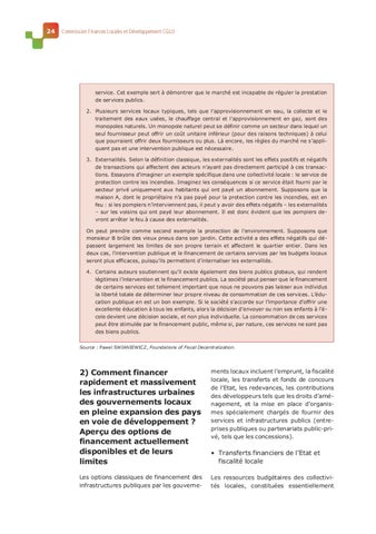 service. Cet exemple sert à démontrer que le marché est incapable de réguler la prestation de services publics. 2. Plusieurs services locaux typiques, tels que l’approvisionnement en eau, la collecte et le traitement des eaux usées, le chauffage central et l’approvisionnement en gaz, sont des monopoles naturels. Un monopole naturel peut se définir comme un secteur dans lequel un seul fournisseur peut offrir un coût unitaire inférieur (pour des raisons techniques) à celui que pourraient offrir deux fournisseurs ou plus. Là encore, les règles du marché ne s’appliquent pas et une intervention publique est nécessaire. 3. Externalités. Selon la définition classique, les externalités sont les effets positifs et négatifs de transactions qui affectent des acteurs n’ayant pas directement participé à ces transactions. Essayons d’imaginer un exemple spécifique dans une collectivité locale : le service de protection contre les incendies. Imaginez les conséquences si ce service était fourni par le secteur privé uniquement aux habitants qui ont payé un abonnement. Supposons que la maison A, dont le propriétaire n’a pas payé pour la protection contre les incendies, est en feu : si les pompiers n’interviennent pas, il peut y avoir des effets négatifs – les externalités – sur les voisins qui ont payé leur abonnement. Il est donc évident que les pompiers devront arrêter le feu à cause des externalités. On peut prendre comme second exemple la protection de l’environnement. Supposons que monsieur B brûle des vieux pneus dans son jardin. Cette activité a des effets négatifs qui dépassent largement les limites de son propre terrain et affectent le quartier entier. Dans les deux cas, l’intervention publique et le financement de certains services par les budgets locaux seront plus efficaces, puisqu’ils permettent d’internaliser les externalités. 4. Certains auteurs soutiennent qu’il existe également des biens publics globaux, qui rendent légitimes l’intervention et le financement publics. La société peut penser que le financement de certains services est tellement important que nous ne pouvons pas laisser aux individus la liberté totale de déterminer leur propre niveau de consommation de ces services. L’éducation publique en est un bon exemple. Si le société s’accorde sur l’importance d’offrir une excellente éducation à tous les enfants, alors la décision d’envoyer ou non ses enfants à l’école devient une décision sociale, et non plus individuelle. La consommation de ces services peut être stimulée par le financement public, même si, par nature, ces services ne sont pas des biens publics. Source : Pawel SWIANIEWICZ, Foundations of Fiscal Decentralization.