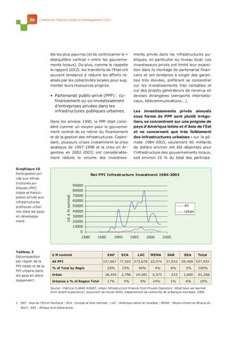 Les investissements privés annuels sous forme de PPP sont plutôt irréguliers, se concentrent sur une poignée de pays d’Amérique latine et d’Asie de l’Est et ne concernent que très faiblement des infrastructures urbaines : sur la période 1984-2003, seulement 60 milliards de dollars environ ont été dépensés pour l’infrastructure des gouvernements locaux, soit environ 10 % du total des participa-