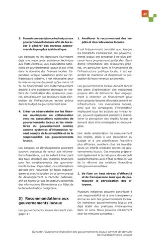 1. Améliorer le recouvrement des impôts et des redevances locales. Il est fréquemment constaté que, lorsque les transferts s’améliorent, les gouvernements locaux ont tendance à ne plus percevoir leurs propres recettes fiscales. Étant donné l’importance des ressources propres, en particulier dans le financement de l’infrastructure publique locale, il est essentiel de maintenir et d’optimiser la perception de leurs revenus autonomes. Les gouvernements locaux doivent lancer des plans d’optimisation des ressources propres afin de démontrer leur engagement à chercher un financement pour leurs propres besoins d’investissement en infrastructure. Les évaluations locales, ainsi que les campagnes d’information impliquant tous les acteurs au niveau local, peuvent également permettre d’améliorer la perception des impôts locaux et doivent donc être envisagées et encouragées. Une réelle amélioration du recouvrement des impôts, alliée à une élaboration du budget et à une planification financière plus efficaces, suscitera chez les investisseurs un intérêt croissant envers les gouvernements locaux. Ces mesures prépareront également le terrain pour des accords supplémentaires avec l’État central en vue de la réforme des relations financières intergouvernementales. 2. Se fixer un haut niveau d’efficacité et de transparence ainsi que de promouvoir la participation des citoyens. Plusieurs initiatives peuvent contribuer à une responsabilité et à une transparence accrue au sein des gouvernements locaux. De nombreux gouvernements locaux ont déjà établi des pratiques intéressantes dans ce sens. Nous pouvons notamment citer les mesures suivantes :
