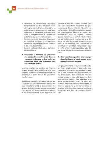partenariat avec les organes de l’État central. Les associations nationales de gouvernements locaux doivent identifier un « champion » de la décentralisation au sein du gouvernement central et établir des partenariats avec cet organe. Garantir qu’une institution, au sein de l’État central, est particulièrement engagée dans la défense du rôle des gouvernements locaux dans le financement de l’infrastructure constitue une condition indispensable pour le renforcement du dialogue et du futur débat entre les gouvernements central et locaux. 4. Renforcer les capacités et s’engager dans l’échange d’expériences entre collectivités partenaires. Les gouvernements locaux peuvent partager leurs expériences et apprendre mutuellement en matière de finances locales, par le biais de leurs associations nationales ou directement. Des initiatives réussies entreprises au niveau local peuvent, dans une certaine mesure, être adaptées à un autre gouvernement local. De plus, les contacts réguliers entre les techniciens en finances locales des gouvernements locaux peuvent permettre la création d’un réseau de soutien actif dont tous peuvent bénéficier.