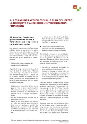 • Difficultés rencontrées par les gouvernements locaux Cependant, les gouvernements locaux font souvent état de nombreuses difficultés pour encourager les prêteurs à financer leur infrastructure publique. Lorsqu’ils ont eu la chance d’entrer en contact avec un prêteur potentiel, les gouvernements locaux ont généralement fait part des préoccupations suivantes : – L’absence de partenariat à long terme pour la mise en œuvre de leurs plans d’investissement pluriannuels, les institutions financières se concentrant en général sur un seul projet d’investissement. – Le taux d’intérêt élevé proposé par le partenaire financier. – La durée des négociations pour obtenir un prêt, qui peuvent facilement durer trois ans, en particulier auprès des banques de développement (ce délai étant beaucoup trop long par rapport à la durée habituelle du mandat des maires).