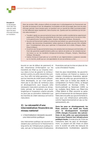 boursé en cas de défaut de paiement) et des mécanismes d’interception sur les transferts de l’Etat ou sur d’autres revenus (dans le but de garantir le remboursement continu du prêt) doivent être prévus. Pour offrir de telles garanties, il faut que les marchés de crédit soient suffisamment développés, ce qui n’est précisément pas le cas dans de nombreux pays en développement, pour lesquels cette nécessaire maturation prendra du temps. Cette période de transition peut durer longtemps et l’expansion urbaine actuelle ne peut pas se permettre d’attendre que les marchés de crédit nationaux arrivent à maturation.