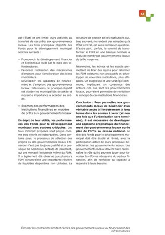 structure de gestion de ces institutions qui, trop souvent, ne rendent des comptes qu’à l’État central, est aussi remise en question. D’autre part, parfois, la volonté de transformer le FDM en une banque normale a exclu de nombreux gouvernements locaux de taille moyenne. Néanmoins, les échecs et les succès permettent de tirer des leçons pour réformer les FDM existants non productifs et développer de nouvelles institutions, plus efficaces. Un diagnostic et une stratégie commune, impliquant un consensus des acteurs clés que sont les gouvernements locaux, pourraient permettre de revitaliser le concept de ces institutions financières. Conclusion : Pour permettre aux gouvernements locaux de bénéficier d’un véritable accès à l’endettement à long terme dans les années à venir (et non une fois que l’urbanisation sera terminée), il est nécessaire de développer une approche pragmatique du financement des gouvernements locaux sur le plan de l’offre au niveau national. Le rôle des Fonds pour le développement municipal doit être étudié et révisé, avec la participation active de leurs principaux bénéficiaires, les gouvernements locaux. Les gouvernements locaux doivent faire reconnaître le rôle qu’ils peuvent jouer pour favoriser la réforme nécessaire du secteur financier, afin de renforcer sa capacité à répondre à leurs besoins.