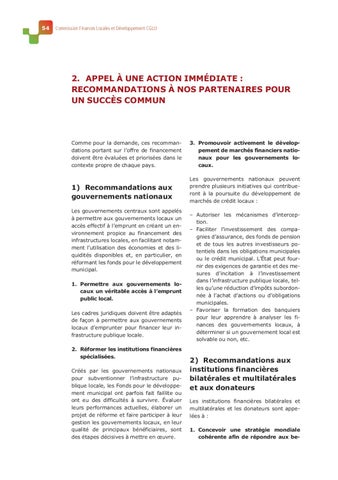 Les gouvernements centraux sont appelés à permettre aux gouvernements locaux un accès effectif à l’emprunt en créant un environnement propice au financement des infrastructures locales, en facilitant notamment l’utilisation des économies et des liquidités disponibles et, en particulier, en réformant les fonds pour le développement municipal. 1. Permettre aux gouvernements locaux un véritable accès à l’emprunt public local. Les cadres juridiques doivent être adaptés de façon à permettre aux gouvernements locaux d’emprunter pour financer leur infrastructure publique locale. 2. Réformer les institutions financières spécialisées. Créés par les gouvernements nationaux pour subventionner l’infrastructure publique locale, les Fonds pour le développement municipal ont parfois fait faillite ou ont eu des difficultés à survivre. Évaluer leurs performances actuelles, élaborer un projet de réforme et faire participer à leur gestion les gouvernements locaux, en leur qualité de principaux bénéficiaires, sont des étapes décisives à mettre en œuvre.