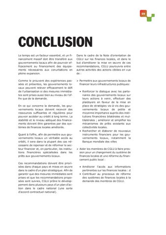 CONCLUSION Le temps est un facteur essentiel, et un financement massif doit être transféré aux gouvernements locaux afin de pourvoir efficacement au financement des équipements nécessaires aux conurbations en pleine expansion.