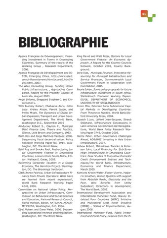 King David and Watt Peter, Options for Local Government Finance: An Economic Approach, A Report for the Country Councils Network, October 2005, County Background. Dirie Ilias, Municipal Finance: Innovative Resourcing for Municipal Infrastructure and Service Provision, Commonwealth Local Government Forum in cooperation with ComHabitat, 2005. Fourie Johan, Some policy proposals for future infrastructure investment in South Africa, Stellenbosch Economic Working Papers: 05/06, DEPARTMENT OF ECONOMICS, UNIVERSITY OF STELLENBOSCH Freire Mila, Petersen John Subnational Capital Markets in Developping Countries: From Theorie to Practice. World Bank/Oxford University Press, 2004. Guasch J.Luis, Laffont Jean-Jacques, Straub Stéphane, Infrastructure Concessions in Latin America Government-led Renegotiations, World Bank Policy Research Working Paper 3749, October 2005. Herrle Peter, Urban Governance Challenges Ahead, ADB/BMZ Investing in Asia Urban Infrastructure, 2007. Kehew Robert, Matsukawa Tomoko & Petersen John, Local Financing For Sub-Sovereign Infrastructure In Developing Countries: Case Studies of Innovative Domestic Credit Enhancement Entities and Techniques,The World Bank, Infrastructure, Economics and Finance Department, March 2005. Komives Kristin Water, Foster Viverin, Halperin Jonathan, Wodon Quentin with support from Abdullah Roohi, Electricity and the Poor, Who Benefits from Utility Subsidies?, Directions in development, The World Bank, 2005. International Development Association and International Monetary Fund, Heavily Indebted Poor Countries (HIPC) Initiative and Multilateral Debt Relief Initiative (MDRI) – Status of Implementation, August 2006. International Monetary Fund, Public Investment and Fiscal Policy–Lessons from the Pi-