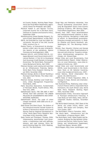 lot Country Studies, Working Paper Prepared by the Fiscal Affairs Department, Approved by Teresa Ter-Minassian, April 2005. McIntyre Robert S. and Nguyen T.D.Coo, Corporate Income Tax in the Bush Years, Institute on Taxation and Economic Policy, September 2004. Mondaymorning (Huset Mandag Morgen), Future of Cities, Special Edition, 14 May 2007. OECD, Aid Extended by Local and State Governments, Pre-print of the DAC Journal 2005, Volume 6, No. 4. Paulais Thierry, Le financement du developpement urbain dans les pays emergents: des besoins et des paradoxes, Agence Francaise de Developpement, 2006. Petersen John B., with Crihfield John B., Linkages Between Local Governments and Financial Markets: A Tool Kit to Developing Sub-Sovereign Credit Markets in Emerging Economies, The World Bank, Municipal Finance Background Series, April 2000. Peterson George, Land Leasing and Land Sale as an Infrastructure Financing Option, World Bank Policy Research Working Paper 4043, November 2006. Peterson George, Banks or Bonds? Building a Municipal Credit Market, The Urban Institute, 2002. Peterson George, Building Local Credit Systems, Urban Management Programme/ World Bank, 2000. Public Securities Association, Fundamentals of Municipal Bonds, Fourth Edition, PSA, New York, 1990. Satterthwaite David, THE TEN AND A HALF MYTHS THAT MAY DISTORT THE URBAN POLICIES OF GOVERNMENTS AND INTERNATIONAL AGENCIES Satterthwaite David, The scale of urban change worldwide 1950-2000 and its underpinnings Shah Anwar and Shen Chunli, The Reform of the Intergovernmental Transfer System to Achieve a Harmonious Society and a Level Playing Field for Regional Development in China, World Bank Policy Research Working Paper 4100, December 2006. Shah, Anwar and Thompson, Theresa, 2004. Implementing decentralized local governance: a treacherous road with potholes, detours, and road closures. Policy Research Working Paper No. 3353. Washington, DC: The World Bank.