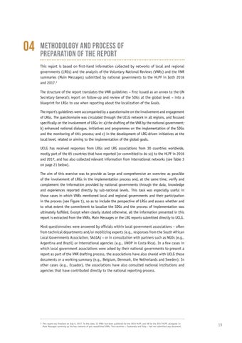 Methodology and process of preparation of the report This report is based on first-hand information collected by networks of local and regional governments (LRGs) and the analysis of the Voluntary National Reviews (VNRs) and the VNR summaries (Main Messages) submitted by national governments to the HLPF in both 2016 and 2017.7 The structure of the report translates the VNR guidelines – first issued as an annex to the UN Secretary General’s report on follow-up and review of the SDGs at the global level – into a blueprint for LRGs to use when reporting about the localization of the Goals. The report’s guidelines were accompanied by a questionnaire on the involvement and engagement of LRGs. The questionnaire was circulated through the UCLG network in all regions, and focused specifically on the involvement of LRGs in: a) the drafting of the VNR by the national government; b) enhanced national dialogue, initiatives and programmes on the implementation of the SDGs and the monitoring of this process; and c) in the development of LRG-driven initiatives at the local level, related or aiming to the implementation of the global goals. UCLG has received responses from LRGs and LRG associations from 30 countries worldwide, mostly part of the 65 countries that have reported (or committed to do so) to the HLPF in 2016 and 2017, and has also collected relevant information from international networks (see Table 3 on page 21 below). The aim of this exercise was to provide as large and comprehensive an overview as possible of the involvement of LRGs in the implementation process and, at the same time, verify and complement the information provided by national governments through the data, knowledge and experiences reported directly by sub-national levels. This task was especially useful in those cases in which VNRs mentioned local and regional governments and their participation in the process (see Figure 1), so as to include the perspective of LRGs and assess whether and to what extent the commitment to localize the SDGs and the process of implementation was ultimately fulfilled. Except when clearly stated otherwise, all the information presented in this report is extracted from the VNRs, Main Messages or the LRG reports submitted directly to UCLG. Most questionnaires were answered by officials within local government associations – often from technical departments and/or mobilizing experts (e.g., responses from the South African Local Governments Association, SALGA) – or in consultation with partners such as NGOs (e.g., Argentina and Brazil) or international agencies (e.g., UNDP in Costa Rica). In a few cases in which local government associations were asked by their national governments to present a report as part of the VNR drafting process, the associations have also shared with UCLG these documents or a working summary (e.g., Belgium, Denmark, the Netherlands and Sweden). In other cases (e.g., Ecuador), the associations have also consulted national institutions and agencies that have contributed directly to the national reporting process.