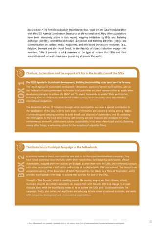 Box 2 below).9 The Finnish association organized regional ‘tours’ on the SDGs in collaboration with the 2030 Agenda Coordination Secretariat at the national level. Many other associations have been intensively active in this regard, mapping initiatives by LRGs and fostering exchange (Sweden), promoting workshops (Botswana) and training activities (Togo), and communication on various media, magazines, and web-based portals and resources (e.g., Belgium, Denmark and the city of Seoul, in the Republic of Korea) to further engage their members. Table 3 presents a quick overview of the type of actions that LRGs and their associations and networks have been promoting all around the world.