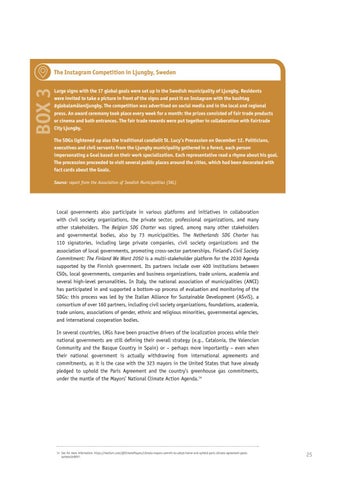 Large signs with the 17 global goals were set up in the Swedish municipality of Ljungby. Residents were invited to take a picture in front of the signs and post it on Instagram with the hashtag #globalamålenljungby. The competition was advertised on social media and in the local and regional press. An award ceremony took place every week for a month: the prizes consisted of fair trade products or cinema and bath entrances. The fair trade rewards were put together in collaboration with Fairtrade City Ljungby. The SDGs lightened up also the traditional candlelit St. Lucy’s Procession on December 12. Politicians, executives and civil servants from the Ljungby municipality gathered in a forest, each person impersonating a Goal based on their work specialization. Each representative read a rhyme about his goal. The procession proceeded to visit several public places around the cities, which had been decorated with fact cards about the Goals. Source: report from the Association of Swedish Municipalities (SKL)
