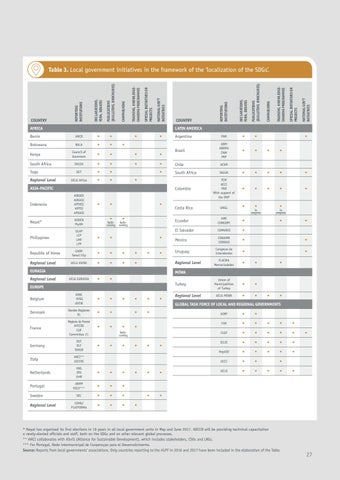 * Nepal has organized its first elections in 19 years in all local government units in May and June 2017. ADCCN will be providing technical capacitation o newly-elected officials and staff, both on the SDGs and on other relevant global processes. ** ANCI collaborates with ASviS (Alliance for Sustainable Development), which includes stakeholders, CSOs and LRGs. *** For Portugal, Rede intermunicipal de Cooperaçao para el Desenvolvimento. Source: Reports from local governments’ associations. Only countries reporting to the HLPF in 2016 and 2017 have been included in the elaboration of the Table.