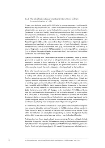 5.1.3 The role of national governments and international partners in the mobilization of LRGs In many countries in the sample, political initiative by national governments is still essential. Wherever this impulse transforms into a nation-wide commitment and political will to include all stakeholders and governance levels, the localization process has been significantly easier. For example, in those cases in which the national government has actively promoted outreach and campaigning aimed at local governments (e.g., Finland’s ‘regional tours’ on the SDGs, coorganized with cities and regions), supported the adoption of covenants or agreements for implementation (e.g., the National Pact the on the achievement of the SDGs adopted in Costa Rica on 9 September 2016, or the agreements at the provincial level in Argentina), organized workshops aimed specifically at local governments (e.g., in Togo), fostered policy alignment between the SDGs and local development plans (e.g., in Colombia and South Africa), or ensured the proactive involvement of LRG associations in monitoring and follow-up processes (e.g., in Belgium, Denmark and Sweden, as mentioned above), participation of LRGs and local stakeholders has been notably higher. Especially in countries with a more centralized system of government, action by national government is usually the main driver of LRG participation. In Jordan, the government presented a roadmap to foster ownership of the SDGs at the sub-national level (i.e., governorates and municipalities). In Madagascar, the government supported an awarenessraising campaign through the media – Madagate – aimed specifically at the local level. On the other hand, in many countries several UN agencies have also played a very important role to support the participation of local and regional governments. UNDP, in particular, is working with national LRG associations in various countries in Africa, Asia and Latin America, supporting awareness-raising efforts via fora and workshops (e.g., Ethiopia and Uganda), dedicated programmes and training (e.g., Bangladesh, Costa Rica, and Honduras) or assisting regions and municipalities in the elaboration of their local plans and making them compatible with the SDGs (in Brazil, Ecuador or Mexico, for example, in the states of Chiapas and Jalisco). The UNDP-ART initiative and UN-Habitat, which in partnership with the Global Taskforce have co-led the UN dialogues on the localization of the SDGs worldwide, have also contributed to the dissemination of the localization approach in various regions. As a consequence of these efforts, several bilateral cooperation schemes and multilateral development banks are now considering the localization approach as a key strategic tool to convert their global agendas into sub-national initiatives and actions, thus improving policy coordination by adopting multi-level coordination and governance systems.20 It is worth noting that, in many countries of this sample, political pressures or electoral agendas have somewhat delayed the process of integration of the SDGs into local political agendas (in France, Portugal or Nepal, for example). On the other hand, in other countries political change within the institutions has actually been an opportunity to promote the alignment of policy with the SDGs in new governmental plans and strategy – e.g., in Brazil and Colombia. As this section has shown, global outreach awareness-raising efforts are still quite limited. Among the 65 reporting countries, SDG awareness among local and regional governments is high and consistent in Europe (and, in particular, in Northern Europe and Germany) and Latin America (Brazil and Colombia stand out in this regard). Strong awareness is limited to only a