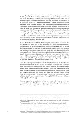 25 Localization or analogous concepts are mentioned as key challenges for implementation in the reviews of Argentina, Bangladesh, Brazil, Chile, Colombia, Egypt, Iran, Jordan, Kenya, Malaysia, Mexico, the Philippines, Samoa, Sierra Leone, Tajikistan and Uganda. Turkey mentions the need to “integrate the SDGs at all levels”, also through regional plans. The Czech Republic, finally, suggests to “mainstream the SDGs into regional and local policies”. Nepal and Nigeria also recommends to “mainstream SDGs into provincial and local level planning”. 26 Benin, Ethiopia, Germany, Honduras, India, Indonesia, Madagascar, Panama, Peru, Portugal, Switzerland, Togo, Uganda, and Uruguay. Morocco refers to ‘regionalization’. 27 Most European countries – and in particular Northern European ones – have a longer tradition of dialogue and concertation across different levels of governance. Other countries, outside of the list of note 24, that refer to stronger coordination include Azerbaijan and China. 28 Most mentions referred to the objectives of sustainable ‘green’ growth (Goals 7, 13, 14 and 15), the reduction of inequalities (Goal 10), health and well-being (Goal 3), peace (Goal 16) and gender equality (Goal 5). References were also made to innovation and competitiveness (Goal 9), water management and sanitation (Goal 6), employment and decent work (Goal 8) and housing policies (Goal 11). All the information was provided by Colombia’s National Department of Planning (DNP). A presentation (in Spanish) on this subject, Incorporación de los ODS en los Planes de Desarrollo de Departamentos y Ciudades Capitales, 2016-2019, is available online at this address: https:// colaboracion.dnp.gov.co/CDT/Sinergia/Documentos/ODS_en_los_PDT.PDF.