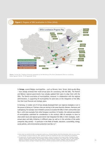 In Europe, several Belgian municipalities – such as Bornem, Gent, Ternat, Heist-op-den-Berg – have already reviewed their multi-annual plans for consistency with the SDGs. The Flemish and Walloon regional governments have already updated their plans to align them with the SDGs. The Flemish association of municipalities, moreover, in collaboration with the regional administration, is supporting 20 municipalities for pilot tests on the integration of the SDGs into their local financial and strategic plans. In Germany, 11 Länder out of 16 have already developed their own regional strategies or are in the process of doing so.30 German cities are moving in the same direction: Bremen, Hannover and Ludwigsburg, for example, have initiated a process to localize the SDGs in their communities (see Box 4, with more examples from other European countries). In Sweden, the national association of municipalities submitted for consideration in the country’s VNR 40 examples to show to what extent local and regional governments had integrated the SDGs in their strategies, multiannual plans and daily initiatives in different areas (as well as in the activities of the public companies they owned) – in particular in the fields of health, education, accessibility, energy, social policies, and environmental protection (see Box 4).31