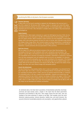 Hannover (Germany) In March 2016, the City Council committed to implement the 2030 Agenda at the local level and, in June 2016, adopted the “My Hannover 2030” strategy. 12 goals, 41 sub-goals and a total of 85 related sustainable development indicators are being used to draft the “1st Sustainability Report”, which will be presented by the end of 2017. More information is available online at this address: http://www.hannovernachhaltigkeit.de. Malmö (Sweden) In September 2015, Malmö signed a declaration to support the 2030 Agenda. By spring of 2016. the city had already linked its own local goals to the SDGs and introduced them into the city budget in 2017 as part of its regular activities. Malmö committed to reduce economic and social inequalities, increase gender equality, foster urban planning measures that give fair access to housing, seek sustainable energy solutions and mitigate climate change effects. More innovative projects are being implementing in socially-deprived areas (e.g., South Sofielund). The city, moreover, has integrated the SDGs in its international cooperation frameworks, in special partnership with local governments in Africa and China. Saint-Fons (France) With the support of an NGO and the technical assistance of the Lyon Urban Planning Agency, the municipality of Saint-Fons (17,000 inhabitants within Lyon’s metropolitan area) has tested a “new approach” using the SDGs as the framework to assess its own development plans. The municipality faces core vulnerabilities due to precarious and energy-poor households, marginalized in unattractive or risk-prone areas with high unemployment rates and inadequate transit and services, yet embedded in an attractive, competitive and innovative metropolitan area such as Lyon. According to a first assessment, 72% of planned local goals and actions were aligned with SDGs. The municipality hopes that the updated strategic vision towards 2030 and the improved alignment of its measures with the SDGs may lead to the creation of local identity, core values and a more coherent linkage with metropolitan policies. Utrecht (the Netherlands) The City of Utrecht has a long-standing tradition when it comes to sustainability: it was declared the first Dutch ‘human rights city’ in 2012, it ranks high in the National Monitor of Sustainable Cities and already has sustainable procurement policies in effect. Once the city explicitly embraced the SDGs as a framework for sustainability policy in the area, a myriad of local stakeholders, companies and societal actors and organizations followed its lead. Utrecht, moreover, has already set ambitious new targets: in 2018, it aims to have the Netherlands’ lowest unemployment rate; it wants to expand the number of solar panels from 4,000 in 2015 to 15,000 in 2020; and it wants 75% of its citizens to be familiar with the SDGs by 2030. The city, finally, has also developed local indicators and baselines