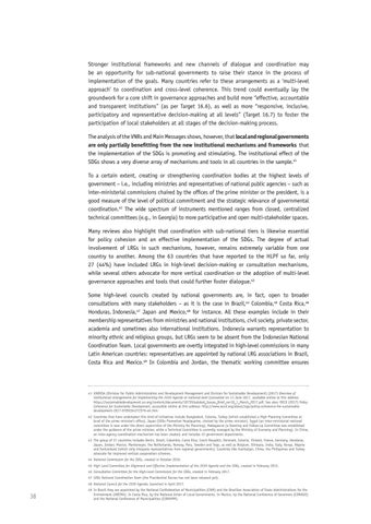 Stronger institutional frameworks and new channels of dialogue and coordination may be an opportunity for sub-national governments to raise their stance in the process of implementation of the goals. Many countries refer to these arrangements as a ‘multi-level approach’ to coordination and cross-level coherence. This trend could eventually lay the groundwork for a core shift in governance approaches and build more “effective, accountable and transparent institutions” (as per Target 16.6), as well as more “responsive, inclusive, participatory and representative decision-making at all levels” (Target 16.7) to foster the participation of local stakeholders at all stages of the decision-making process. The analysis of the VNRs and Main Messages shows, however, that local and regional governments are only partially benefitting from the new institutional mechanisms and frameworks that the implementation of the SDGs is promoting and stimulating. The institutional effect of the SDGs shows a very diverse array of mechanisms and tools in all countries in the sample.41 To a certain extent, creating or strengthening coordination bodies at the highest levels of government – i.e., including ministries and representatives of national public agencies – such as inter-ministerial commissions chaired by the offices of the prime minister or the president, is a good measure of the level of political commitment and the strategic relevance of governmental coordination.42 The wide spectrum of instruments mentioned ranges from closed, centralized technical committees (e.g., in Georgia) to more participative and open multi-stakeholder spaces. Many reviews also highlight that coordination with sub-national tiers is likewise essential for policy cohesion and an effective implementation of the SDGs. The degree of actual involvement of LRGs in such mechanisms, however, remains extremely variable from one country to another. Among the 63 countries that have reported to the HLPF so far, only 27 (44%) have included LRGs in high-level decision-making or consultation mechanisms, while several others advocate for more vertical coordination or the adoption of multi-level governance approaches and tools that could further foster dialogue.43 Some high-level councils created by national governments are, in fact, open to broader consultations with many stakeholders – as it is the case in Brazil,44 Colombia,45 Costa Rica,46 Honduras, Indonesia,47 Japan and Mexico,48 for instance. All these examples include in their membership representatives from ministries and national institutions, civil society, private sector, academia and sometimes also international institutions. Indonesia warrants representation to minority ethnic and religious groups, but LRGs seem to be absent from the Indonesian National Coordination Team. Local governments are overtly integrated in high-level commissions in many Latin American countries: representatives are appointed by national LRG associations in Brazil, Costa Rica and Mexico.49 In Colombia and Jordan, the thematic working committee ensures