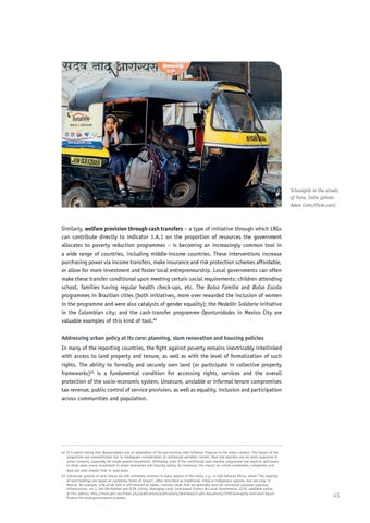 Similarly, welfare provision through cash transfers – a type of initiative through which LRGs can contribute directly to indicator 1.A.1 on the proportion of resources the government allocates to poverty reduction programmes – is becoming an increasingly common tool in a wide range of countries, including middle-income countries. These interventions increase purchasing power via income transfers, make insurance and risk protection schemes affordable, or allow for more investment and foster local entrepreneurship. Local governments can often make these transfer conditional upon meeting certain social requirements: children attending school, families having regular health check-ups, etc. The Bolsa Familia and Bolsa Escola programmes in Brazilian cities (both initiatives, more over rewarded the inclusion of women in the programme and were also catalysts of gender equality); the Medellín Solidaria initiative in the Colombian city; and the cash-transfer programme Oportunidades in Mexico City are valuable examples of this kind of tool.62 Addressing urban policy at its core: planning, slum renovation and housing policies In many of the reporting countries, the fight against poverty remains inextricably interlinked with access to land property and tenure, as well as with the level of formalization of such rights. The ability to formally and securely own land (or participate in collective property frameworks)63 is a fundamental condition for accessing rights, services and the overall protection of the socio-economic system. Unsecure, unstable or informal tenure compromises tax revenue, public control of service provision, as well as equality, inclusion and participation across communities and population.