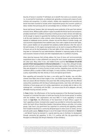Security of tenure is essential if individuals are to benefit from land as an economic asset, i.e., to use land for investments, as collateral and, generally, as revenue and a means of social inclusion and recognition. In certain contexts, reliable rules regulating land ownership and tenure have been essential to include certain marginalized groups into economic systems or labour markets that previously did not acknowledge them as members of the community.64 Secure land tenure, however, does not necessarily ensure protection of the poor from external economic forces. Without public policies in place to provide this kind of service and assistance, privately-owned land in conditions of poverty or lacking access to basic services and needs may not be enough to improve or guarantee the livelihood and security of poorer households. This is all the more important in urban contexts, where informal settlements are significantly more exposed to inadequate service provision, disaster risk and the effects of climate change, and socio-economic marginalization from wealthier areas. Even under a regime of secure land rights, that is, poorer dwellers are not protected from predatory market behaviour when the value of the land increases. In this regard, local governments can do much to recognize different forms of tenure and act for the formalization of the land rights of their citizens. Secure tenure has long been an instrument for local administrations interested in improving quality of life and socio-economic inclusion of slums and other marginalized areas in conditions of poverty. Urban planning measures that actively address the issue of slums and socio-economically marginalized areas in urban settlements are among the most common programmes aimed at the urban poor. Many cities in low- and middle-income countries host between 30 and 60 percent of their total population in informal settlements or in areas that, although formally planned and built, end up hosting a disproportionately larger number of residents than what they were designed to in terms of access to basic services. Upgrading slums and their living conditions affects a number of SDGs and Targets. In many countries, achieving these goals is a policy responsibility that falls directly on local and regional governments. Slum upgrading and renovation has been a core policy goal for decades, now, and often schemes have fallen short of their targets in low- and middle-income nations. Nevertheless, there are several LRG-led initiatives that prove that LRGs working directly with the affected communities (sometimes with the help of national governments, most times with bottom-up initiatives of local groups and civil society organizations) are actually able to take on this challenge and – consistently with the SDGs – can ensure access for all to adequate, safe and affordable housing and basic services. In Pune (India), the effectiveness of the housing programme of the Municipal Corporation increased as it switched from plans to build new housing ‘for low-income groups’ to working with the residents, their organizations and local NGOs in in-situ upgrading in existing ‘slums’. In Cape Town, the effectiveness of the Government of South Africa’s support for ‘slum’ upgrading schemes increased when support was provided to community organizations within the South African Shack/Slum Dwellers International Alliance and other civil society groups. Cape Town’s city government has supported six community led upgrading schemes that included re-blocking to a community-designed layout to allow access to streets, services and safe public spaces. Mukuru (Kenya) is one of the largest informal settlements in Nairobi – and Nairobi County has declared it a special planning area to facilitate its development through community led upgrading. In this, it is working with the city government and Muungano wa Wanavijiji (the Kenyan Federation of Slum Dwellers).
