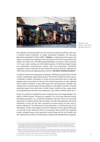Slum upgrading and housing policies have also proved to be particularly effective when there is enhanced vertical coordination. As regards local-national cooperation, The Community Organizations Development Institute (CODI) in Thailand is a national government agency that supports community-driven upgrading at scale and support for this from local governments and utilities. From 2003 to 2011, the CODI approved 858 projects in more than 1,500 communities in 277 urban centres covering more than 90,000 households. The CODI also helped formalize and institutionalize community-driven solutions within local governments. International cooperation is often as important: the Asian Coalition for Community Action has supported over 1,000 small community led upgrading projects working in 165 cities in 19 different countries.65 A number of countries have made progress in reducing or stabilizing slum growth rates in the last 15 years, including Brazil, Egypt, Mexico, Morocco,66 South Africa, Thailand and Tunisia. Success is attributed to political commitment at central and local government levels to large-scale upgrading and service provision for the poor. More promising programmes on urban upgrading tend to combine investments in basic infrastructure with social programmes. Although many initiatives focus on physical aspects of living conditions, to the neglect of economic, social and institutional aspects, more recent action in Brazil, Jamaica, Vietnam and Iran, among others, are incorporating these dimensions (e.g. employment, crime, violence, childcare, health, etc.).67 Finally, it is important to highlight the need to include the voices of the disadvantaged in the design of effective policies, including slum upgrading. This can be done effectively through participatory governance, e.g., institutional arrangements that allow citizens and community organizations to influence political decision-making, and right based approaches that extend entitlements to those who lack them, particularly low-income groups and those living in informal settlements.68 The effectiveness of local governments in achieving the goals of the 2030 Agenda, the New Urban Agenda and the Paris Agreement will also depend significantly on the quality of their relationship with low-income groups. Most successful ‘slum’ upgrading schemes succeeded because urban governments worked closely with the ‘slum’ dwellers and their organizations and other civil society groups in designing and implementing the upgrading.