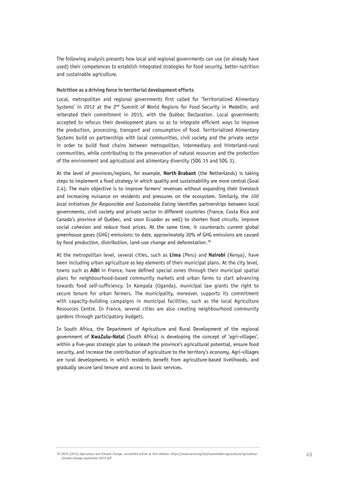 The following analysis presents how local and regional governments can use (or already have used) their competences to establish integrated strategies for food security, better nutrition and sustainable agriculture. Nutrition as a driving force in territorial development efforts Local, metropolitan and regional governments first called for ‘Territorialized Alimentary Systems’ in 2012 at the 2nd Summit of World Regions for Food Security in Medellín, and reiterated their commitment in 2015, with the Québec Declaration. Local governments accepted to refocus their development plans so as to integrate efficient ways to improve the production, processing, transport and consumption of food. Territorialized Alimentary Systems build on partnerships with local communities, civil society and the private sector in order to build food chains between metropolitan, intermediary and hinterland-rural communities, while contributing to the preservation of natural resources and the protection of the environment and agricultural and alimentary diversity (SDG 15 and SDG 3). At the level of provinces/regions, for example, North Brabant (the Netherlands) is taking steps to implement a food strategy in which quality and sustainability are more central (Goal 2.4). The main objective is to improve farmers’ revenues without expanding their livestock and increasing nuisance on residents and pressures on the ecosystem. Similarly, the 100 local initiatives for Responsible and Sustainable Eating identifies partnerships between local governments, civil society and private sector in different countries (France, Costa Rica and Canada’s province of Québec, and soon Ecuador as well) to shorten food circuits, improve social cohesion and reduce food prices. At the same time, it counteracts current global greenhouse gases (GHG) emissions: to date, approximately 30% of GHG emissions are caused by food production, distribution, land-use change and deforestation.70 At the metropolitan level, several cities, such as Lima (Peru) and Nairobi (Kenya), have been including urban agriculture as key elements of their municipal plans. At the city level, towns such as Albi in France, have defined special zones through their municipal spatial plans for neighbourhood-based community markets and urban farms to start advancing towards food self-sufficiency. In Kampala (Uganda), municipal law grants the right to secure tenure for urban farmers. The municipality, moreover, supports its commitment with capacity-building campaigns in municipal facilities, such as the local Agriculture Resources Centre. In France, several cities are also creating neighbourhood community gardens through participatory budgets. In South Africa, the Department of Agriculture and Rural Development of the regional government of KwaZulu-Natal (South Africa) is developing the concept of ‘agri-villages’, within a five-year strategic plan to unleash the province’s agricultural potential, ensure food security, and increase the contribution of agriculture to the territory’s economy. Agri-villages are rural developments in which residents benefit from agriculture-based livelihoods, and gradually secure land tenure and access to basic services.