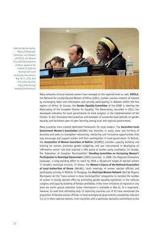 Many networks of local elected women have emerged at the regional level as well. REFELA, the Network for Locally Elected Women of Africa (2001), tackles common matters of interest by exchanging ideas and information and actively participating in debates within the five regions of Africa. In Europe, the Gender Equality Committee of the CEMR is steering the Observatory of the European Charter for Equality. The Observatory, launched in 2012, has developed indicators for local governments to track progress in the implementation of the Charter. It also showcases best practices and examples of successful local policies on gender equality and facilitates peer-to-peer learning among local and regional governments. Many countries have created dedicated frameworks for local leaders. The Australian Local Government Women’s Association (ALGWA) has branches in every state and territory of Australia and seeks to strengthen networking, mentoring and innovative opportunities that may encourage and support women and their participation in local government. In Bolivia, the Association of Women Councilors of Bolivia (ACOBOL) provides capacity building and training for women, promotes gender budgeting, and was instrumental in developing an ‘affirmative action’ rule that required a 30% quota of women party candidates. In Canada, the Federation of Canadian Municipalities’ Standing Committee on Increasing Women’s Participation in Municipal Government (2005) launched, in 2008, the Regional Champions Campaign, a long-standing effort to reach by 2026 a 30-percent target of elected women in Canada’s municipal councils. In Ghana, the Women’s Caucus of the National Association of Local Authorities of Ghana (NALAG), hosts meetings of women elected officials and participates actively in REFELA. In Paraguay, the Municipal Women Network (Red de Mujeres Munícipes) ran the “more women in more municipalities” programme to increase the number of women in locally elected office by promoting gender equality legislation in the national congress and capacity building of female candidates. A few more initiatives at regional or city level are worth special attention (more information is available in Box 6). It is important, however, to note that ultimately only 12 reporting countries out of 63 have mentioned the proportion of elected women officials in local and regional governments (covered by indicator 5.5.1) in their national reviews. Even countries with a particular declared commitment to the