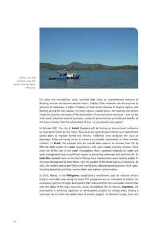 For cities and metropolitan areas, sea-level rises imply an unprecedented exposure to flooding, erosion and extreme weather events. Coastal cities, moreover, are also exposed to pollution of waterways, a higher incidence of water-borne diseases in tropical regions, and flooding during the wet seasons. For these reasons, coastal towns, metropolises and regions should be proactive advocates of the preservation of sea and marine resources – and, on the other hand, should be aware of economic, social and environmental potential and benefits of the ‘blue economy’ that the achievement of Goal 14 can promote and support. In October 2017, the city of Malmö (Sweden) will be hosting an international conference on Local Governments for the Ocean. Many local and regional governments have implemented spatial plans to regulate formal and informal residential areas alongside the coast or waterways. Cities are taking action to enhance sustainable urbanization in these sensible contexts. In Brazil, the national plan for coastal areas expects to increase from 5% to 20% the total number of coastal municipalities with clear coastal planning schemes. Since cities are at the core of the water consumption chain, upstream measures on water and waste management have a significant impact on preserving waterways and maritime life. In Costa Rica, coastal towns on the Gulf of Nicoya have implemented a participatory project in Municipal Management of Solid Waste, with the support of the Waste Agency of Catalonia. By 2025, the project aims at preventing and significantly reducing marine pollution of all types, including terrestrial activities, marine debris and nutrient contamination. In 2010, Manila, in the Philippines, established a resettlement plan for informal settlers living in vulnerable areas along the coast. This programme was an instrument to address the exclusionary patterns of urban development that had pushed the most vulnerable communities onto the edges of the city’s economic, social and political life. In Rosario, Argentina, the municipality is enforcing regulation on development projects on coastal areas, levying a municipal tax to retain the added-value of private projects. In Northern Europe, local and