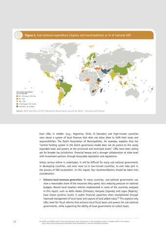 Even LRGs in middle- (e.g., Argentina, Chile, El Salvador) and high-income countries warn about a system of local finances that does not allow them to fulfil their tasks and responsibilities. The Dutch Association of Municipalities, for example, explains that the “central funding system in the Dutch governance model does not do justice to the vastly expanded tasks and powers at the provincial and municipal levels”. LRGs have been asking ask for broader tax jurisdiction, financial leeway and a stronger collaboration at state level with investment partners through favourable legislation and regulations. Unless serious reform is undertaken, it will be difficult for many sub-national governments in developing countries, and even more so in low-income countries, to ever take part in the process of SDG localization. In this regard, four recommendations should be taken into consideration: • Enhance local revenues generation. In many countries, sub-national governments can raise a reasonable share of the resources they spend, thus reducing pressure on national budgets. Recent local taxation reforms implemented in some of the countries analyzed in this report, such as Addis Ababa (Ethiopia), Kampala (Uganda) and Lagos (Nigeria), have shown positive results in public financial capacities when strengthened through improved management of local taxes and capture of land added-value.85 This explains why LRGs need fair fiscal reforms that enhance local fiscal bases and powers for sub-national governments, while supporting the ability of local governments to collect taxes.