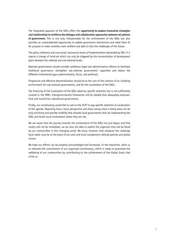 The integrated approach of the SDGs offers the opportunity to explore innovative strategies and relationships to reinforce the dialogue and collaborative approaches between all spheres of government. This is not only indispensable for the achievement of the SDGs but also provides an unprecedented opportunity to update governance mechanisms and make them fit for purpose to make societies more resilient and able to face the challenges of the future. The policy coherence and cross-level, transversal means of implementation demanded by SDG 17.4 require a change of mind-set which can only be triggered by the harmonization of development plans between the national and sub-national levels. National governments should consider ambitious legal and administrative reforms to facilitate multilevel governance, strengthen sub-national governments’ capacities and reduce the different institutional gaps (administrative, fiscal, and political). Progressive and effective decentralization should be at the core of the creation of an ‘enabling environment’ for sub-national governments, and for the localization of the SDGs. The financing of the localization of the SDGs deserves specific attention but is not sufficiently covered in the VNRs. Intergovernmental frameworks will be needed that adequately empower, fund and incentivize subnational governments. Finally, our constituency would like to call on the HLPF to pay specific attention to localization of the agenda. Reporting from a local perspective and show-casing what is being done can be truly enriching and provide visibility that rewards local governments that are implementing the SDGs and foster local involvement where they are not. We are aware that the journey towards the achievement of the SDGs has just begun and that results will not be immediate, we are also not able to predict the urgencies that will be faced by our communities in this changing world. We know, however, that whatever the challenge local needs must be at the heart of our work and must complement national policies and global visions. We hope our efforts can be properly acknowledged and harnessed. In the meantime, allow us to reiterate the commitment of our organized constituency, which is ready to guarantee the wellbeing of our communities by contributing to the achievement of the Global Goals that unite us.