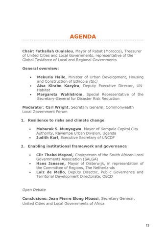 AGENDA Chair: Fathallah Oualalou, Mayor of Rabat (Morocco), Treasurer of United Cities and Local Governments, representative of the Global Taskforce of Local and Regional Governments General overview: