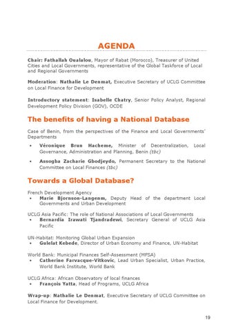 AGENDA Chair: Fathallah Oualalou, Mayor of Rabat (Morocco), Treasurer of United Cities and Local Governments, representative of the Global Taskforce of Local and Regional Governments Moderation: Nathalie Le Denmat, Executive Secretary of UCLG Committee on Local Finance for Development Introductory statement: Isabelle Chatry, Senior Policy Analyst, Regional Development Policy Division (GOV), OCDE