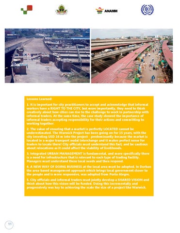 Lessons Learned: 1. It is important for city practitioners to accept and acknowledge that informal workers have a RIGHT TO THE CITY, but more importantly, they need to think creatively about how cities can rise to the challenge to work in partnership with informal traders. At the same time, the case study showed the importance of informal traders accepting responsibility for their actions and committing to working together. 2. The value of ensuring that a market is perfectly LOCATED cannot be underestimated. The Warwick Project has been going on for 15 years, with the city investing USD 16 m into the project - predominantly because the market is located in a major transport nodal interchange and it makes perfect sense for traders to locate there! City officials must understand this fact, and be cautious about relocations as it could affect the viability of livelihoods. 3. Integrated URBAN MANAGEMENT is fundamental, and more specifically there is a need for infrastructure that is relevant to each type of trading facility. Managers must understand these local needs and then respond. 4. A NEW WAY OF DOING BUSINESS at the local area must be adopted. In Durban the area-based management approach which brings local government closer to the people and is more responsive, was adopted from Porto Alegre. 5. City officials and informal traders must jointly develop a SHARED VISION and think about how this vision will be funded. Doing this incrementally and progressively was key to achieving the scale the size of a project like Warwick.