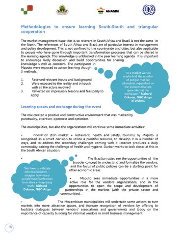 Methodologies to ensure learning South-South and triangular cooperation The market management issue that is so relevant in South Africa and Brazil is not the same in the North. The references of South Africa and Brazil are of particular interest in management and policy development. This is not confined to the countryside and cities, but also applicable to people who have gone through important transformation processes that can be shared in the learning agenda. This knowledge is unblocked in the peer learning agenda. It is important to encourage lively discussion and build opportunities for sharing knowledge s well as concerns. The participants in Maputo were exposed to action learning though 3 methods: “In a market we see 1. 2. 3.