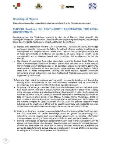 MAPUTO Roadmap ON SOUTH-SOUTH COOPERATION FOR LOCAL GOVERNMENTS: Participants from the Workshop organized by the city of Maputo, UCLG, ANAMM, ILO, Norwegian Ministry of Cooperation, Cities Alliance and originating from Maputo, Mozambique cities, Belo Horizonte, Porto Alegre (Brazil) and Durban (South AFrica) 1) Express their satisfaction with the SOUTH-SOUTH AND TRIANGULAR (SSTC) knowledge exchange initiated in Maputo in the field of formal and informal markets, Local Economic Development and the promotion of Decent Work. The workshop put emphasis on the role of local governments in bettering the conditions of work, hygiene, health, waste management, and in creating decent work conditions and employment in the city markets. The sharing of experience from other cities (Belo Horizonte, Durban, Porto Alegre and cities in Mozambique) along with in-depth presentation and field visits to the Maputo market helped identify strategic areas for co-operation : inclusive approach to community development; involvement of local association, social partners, markets leaders. Critical areas such as waste management, cleaning and toilet facilities, hygiene conditions surrounding animal selling have also been highlighted. Practical approaches have been suggested by local actors. 2) Reiterate their intent to continue working jointly in capacity building and knowledge sharing across municipalities in the same horizontal framework and to contribute to developimg a local government South-South co-operation program. To pursue the exchange, a number of opportunities have been laid out and participants have taken note of their role in the preparation and organization of these events. Already in the planning, activities are scheduled in Dakar, December 2012, within the framework of Africities, in March 2013, in Durban, to build the capacities of intermediary size cities for local development (from South Africa, Malawi, Namibia, Kenya, Mozamique, Brazil) in April, a political roundtable on south-south cooperation will be set up in the framework of the National Congress of Local Authorities in Brazil. UCLG will provide support to these activities and the involvement of ILO will be sought, specifically with respect to the cities of Belo Horizonte and Durban connecting to the respective national ILO offices. 3) Invite other local and regional governments both from the North and the South to join in the SSTC experience, as similar knowledge could be gained by reinforcing SSTC networking among mayors and local/regional governments to develop information sharing and peer learning activities in the area of decent work and local development. Existing and foreseen co-operation agreement between cities of the South (between Porto Alegre and Mozambique cities, between Belo Horizonte and Maputo (in process), between Durban and cities from the South part of Africa), between Maputo and Barcelona, are viewed as opportunities to pursue knowledge exchange in the area of strategic planning, including local Economic Development and Decent work.