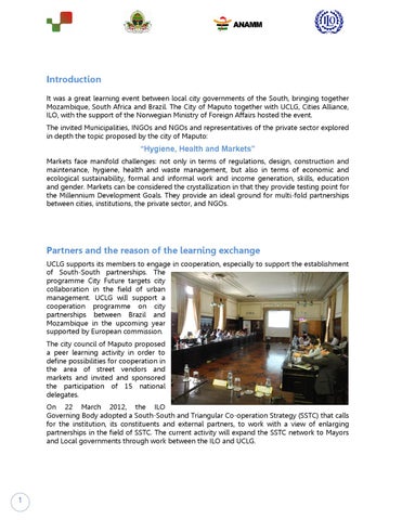 Partners and the reason of the learning exchange UCLG supports its members to engage in cooperation, especially to support the establishment of South-South partnerships. The programme City Future targets city collaboration in the field of urban management. UCLG will support a cooperation programme on city partnerships between Brazil and Mozambique in the upcoming year supported by European commission. The city council of Maputo proposed a peer learning activity in order to define possibilities for cooperation in the area of street vendors and markets and invited and sponsored the participation of 15 national delegates. On 22 March 2012, the ILO Governing Body adopted a South-South and Triangular Co-operation Strategy (SSTC) that calls for the institution, its constituents and external partners, to work with a view of enlarging partnerships in the field of SSTC. The current activity will expand the SSTC network to Mayors and Local governments through work between the ILO and UCLG.
