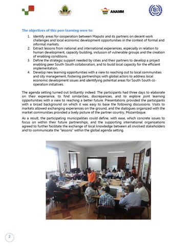 The objectives of this peer learning were to: 1. Identify areas for cooperation between Maputo and its partners on decent work challenges and local economic development opportunities in the context of formal and informal markets. 2. Extract lessons from national and international experiences, especially in relation to human development, capacity building, inclusion of vulnerable groups and the creation of enabling conditions. 3. Define the strategic support needed by cities and their partners to develop a project enabling peer South-South collaboration, and to build local capacity for the efficient implementation. 4. Develop new learning opportunities with a view to reaching out to local communities and city management, fostering partnerships with global actors to address local economic development issues and identifying potential areas for South-South cooperation initiatives. The agenda setting turned out brilliantly indeed. The participants had three days to elaborate on their experience, to find similarities, discrepancies, and to explore joint learning opportunities with a view to reaching a better future. Presentations provided the participants with a broad background on which it was easy to base the following discussions. Visits to markets allowed exchanging experiences on the ground, and the dialogues organized with the market communities provided a lively picture of the partner country, Mozambique. As a result, the participating municipalities could define, with ease, which concrete issues to focus on within their future partnerships, and the supporting international organisations agreed to further facilitate the exchange of local knowledge between all involved stakeholders and to communicate the “lessons� within the global agenda setting.