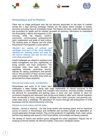Mozambique and its Markets There was no single participant who did not become passionate on the topic of markets during the 3 days learning exchange. Markets are the places where changes in society, economy and policy have an immediate impact. The Maputo city team, under the leadership of the councillors for health and for markets, provided all necessary information to understand the Municipality´s efforts and responses in one morning, while the Maputo vendors´ community communicated entrepreneurial spirit, organization and pride of local culture. The starting point of Maputo and the other Mozambican municipalities is quite specific: