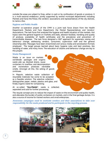 outside the areas are subject to fines, either in cash or by confiscation of goods or produce. It is a multi-sectoral endeavour, jointly supported by several municipal departments including Markets and Fairs) the Police, the vendors’ associations and representatives of the city districts, to name a few. Hygiene and Public Health Another co-operative project of the CMM is a joint task force drawn from the Health Department, Markets and Fairs Department, the Market Representatives and Vendors’ Associations. The task force first analysed the hygiene and health situation of the markets. Hot topics were the general hygiene on markets and stalls, ablution facilities, handling and quality of produce, availability of health certificates and the prevalence and prevention of transmittable diseases. The task force designed a 360° approach for awareness raising and behaviour change, addressing vendors, consumers, supervision staff and the general citizenship alike. Messages have been streamlined and various media and sensitization formats employed. The target groups learned about basic hygiene rules and best practices, like handling of water, and many more. The education of citizens and behaviour change are key to this project. Waste Management Waste is an issue on markets worldwide: packages and organic waste pile up, blocked drains, cause containers to overflow, and decomposition and incineration produces inevitable smells. Amongst all this, the selling of goods continues. In Maputo, selective waste collection of recyclable materials has come to be accepted as a feasible solution. The selective collection distinguishes paper, metals, plastics and glass, and finally organic waste for composting. At so-called “Eco-Points”, waste is separated and sold for further processing.