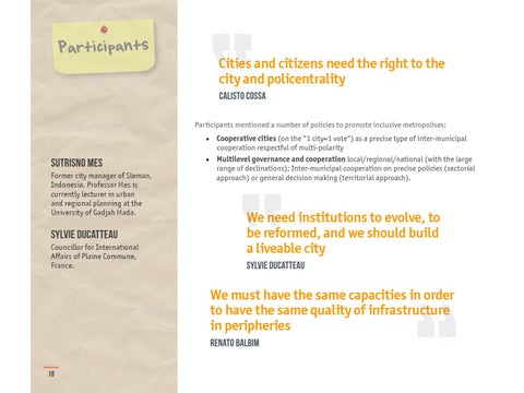 Cities and citizens need the right to the city and policentrality Calisto Cossa Participants mentioned a number of policies to promote inclusive metropolises:
